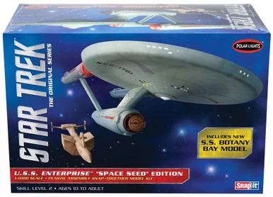 Star Trek U. S. S. Enterprise “Space Seed” EditionIn the classic STAR TREK episode, “Space Seed,” The U. S. S. Enterprise found a derelict space ship registered as the S. S. Botany Bay. Khan Noonien Shingh, a super-powered tyrant of audaciously attempt to seize control of the Enterprise. Only through guile and bravery was Captain Kirk able to triumph over the foe and save Khan on Ceti Alpha V where he would wait 18 long years before a chance encounter gained him a second opportunity to meet out his wrath on Kirk. This model kit celebrates the classic Star Trek episode by offering the U. S. S. Enterprise along with the S. S. Botany Bay for the first time. Optional parts are included to build the Enterprise in one of three configurations. Marking decals, pictorial assembly guide and dome base all included.